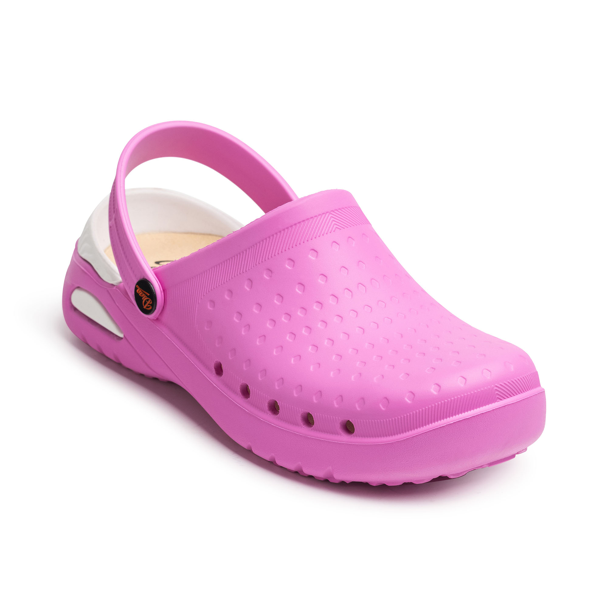 Ultralichte, antibacteriële, latexvrije, uit één stuk bestaande, anatomische, antislip EVA-klomp. Machinewasbaar tot 40°C. Met opklapbare achterband tussen hiel en teen, geperforeerd aan de zijkanten om transpiratie en reiniging te vergemakkelijken en te voorkomen dat vloeistoffen of vloeistoffen rechtstreeks in de klomp terechtkomen. Uitneembare PU-zool met grote energieherstellende eigenschappen tijdens het lopen, gevoerd met D’DRY®-stof.